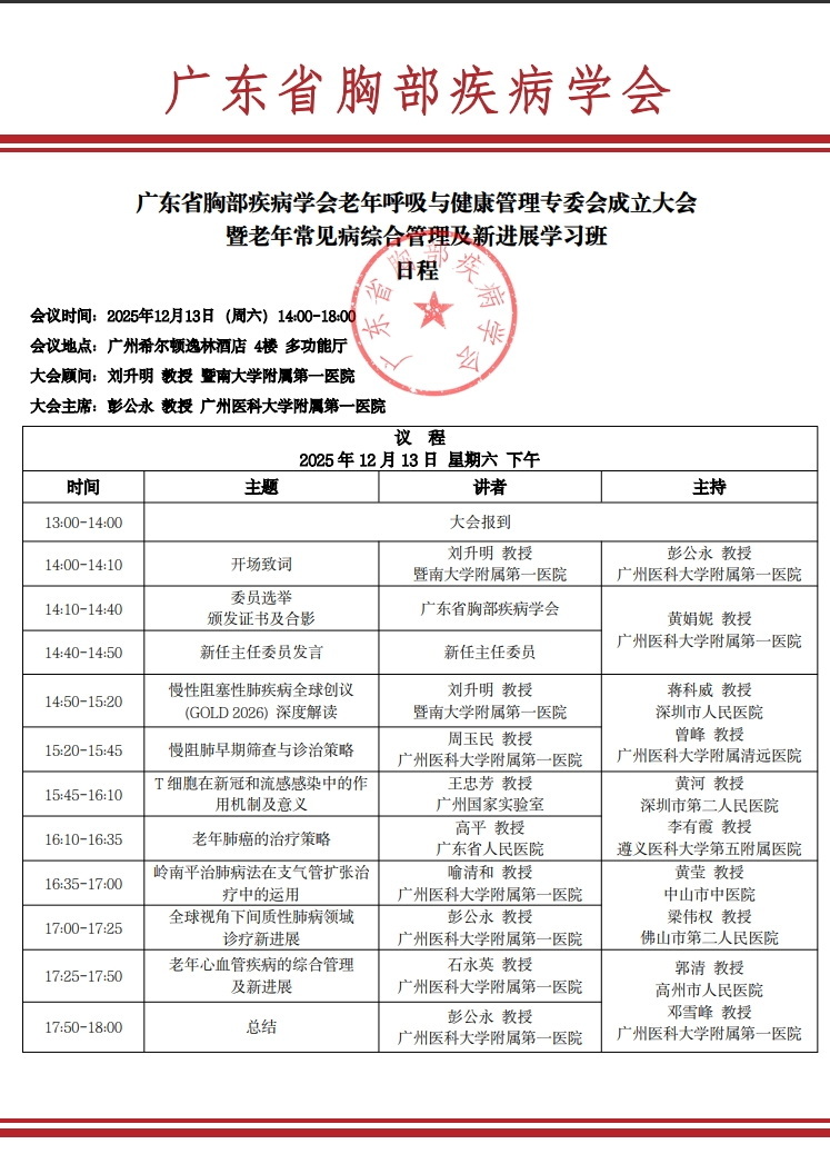 12月13日广东省胸部疾病学会老年呼吸与健康管理专委会成立大会暨老年常见病综合管理及新进展学习班广州希尔顿逸林酒店 4楼 多功能举办,喻清和主任医师受邀出席并授课,喻清和主任主讲了《岭南平治肺病法在支气管扩张治疗中的运用》,与呼吸专科医师进行学术交流。