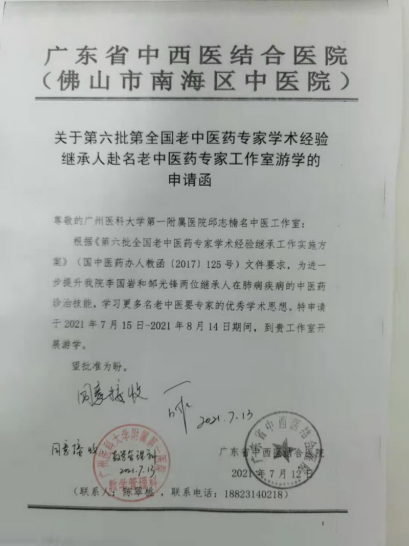 2021年7月15日至8月14日工作室接收了广东省中西医结合医院李国岩和邹光锋等两位主任前来游学,主要跟广东省名中医邱志楠教授学习。