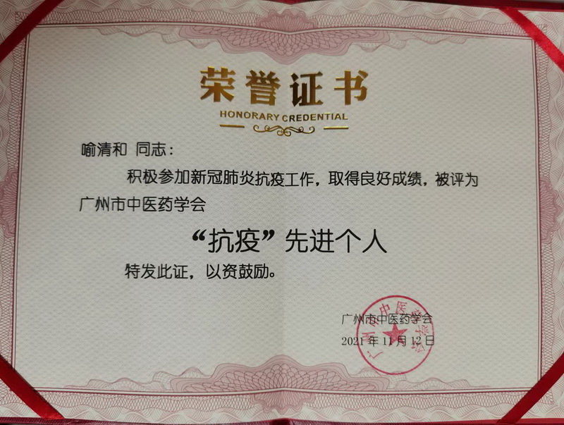 喻清和获得广州市中医药学会”抗疫“先进个人荣誉称号