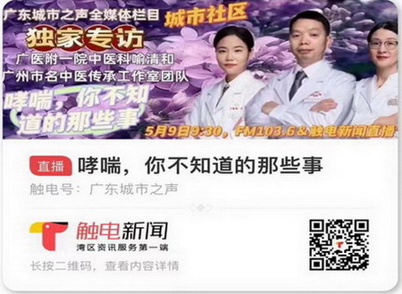应广东城市之声(FM103.6),触电新闻之邀请,喻清和主任医师携团队成员朱琳主任医师、黄琦玢主治医师5月9日上午到越秀区人民北路686号广东广播中心进行专题直播“哮喘,你不知道的那些事”。直播活动持续1个半小时。直播就广大群众关心的哮喘相关问题进行专业答疑,如: 传统中医认为“哮喘”是“哮”症和“喘”症所形成的,应如何理解“哮”症和“喘”症? 中医认为哮喘疾病的成的根源是什么? 怎么样的人容易患哮喘问题? 什么季节容易诱发哮喘疾病发生? 哮喘的类型有哪些?各有什么特征?等等。