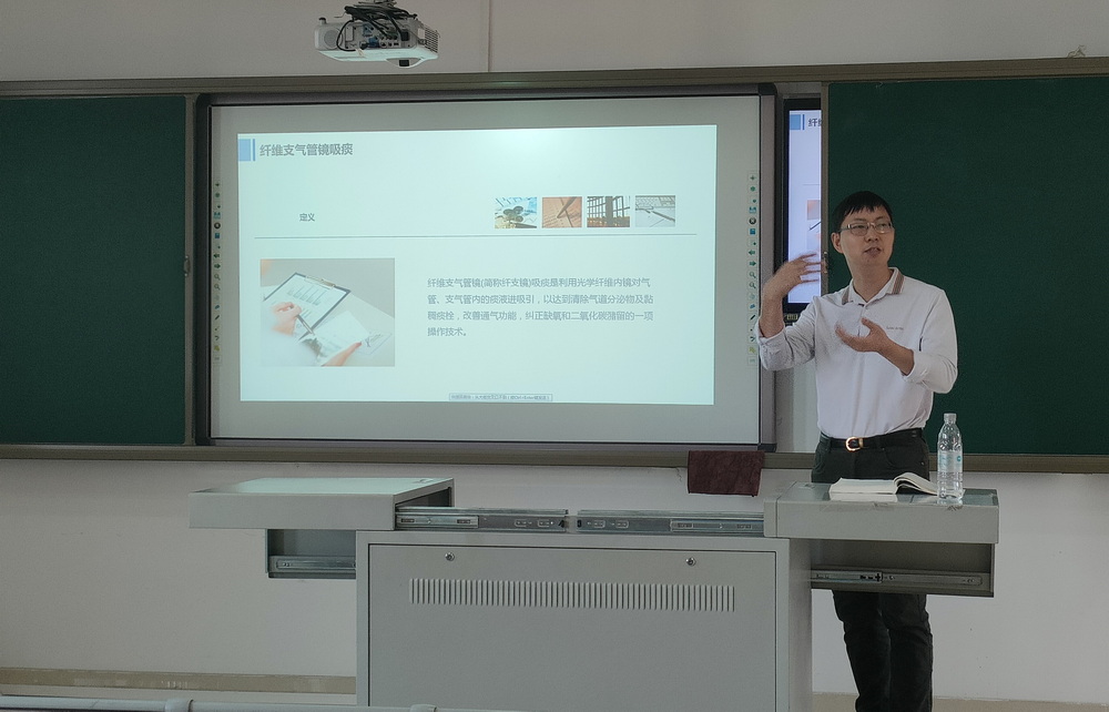 今天上午张亚雷教授9:15的课,为保证教学质量,张教授提前了一个小时到校,在教室演练课件。主讲内容是“呼吸系统疾病的常见临床检查”,出色的完成了对我中西医专业研究生的授课任务并和学生合影。