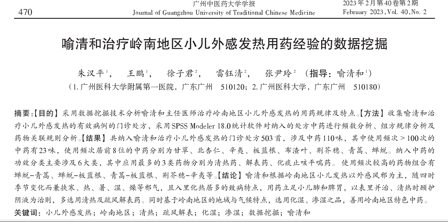 《喻清和治疗岭南地区小儿外感发热用药经验的数据挖掘》刊出