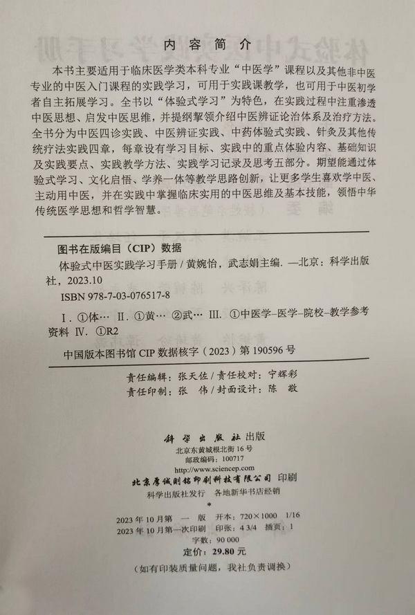 黄婉怡和武志娟主编的《体验式中医实践学习手册》出版